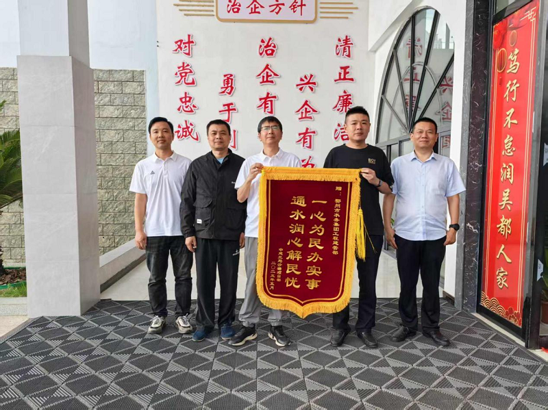 2025年5月9日,中建三局新建沙塘小区项目部向水务集团赠送一面印有“一心为民办实事,通水润心解民忧”的锦旗,感谢水务集团公司在项目供水设施建设中提供的专业高效支持与服务,助力解决了居民用水“最后一公里”的难题。