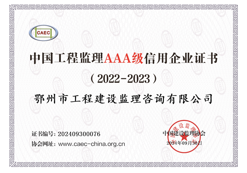 近日,鄂州市工程建设监理咨询有限公司传来喜讯。经过严格的评审、结果公示,我公司荣获由中国建设监理协会颁发的“3A诚信监理企业信用等级证书”,标志着我公司在企业管理、服务质量、合同履行、社会责任等多方面达到行业领先水平,成为监理咨询行业典范。