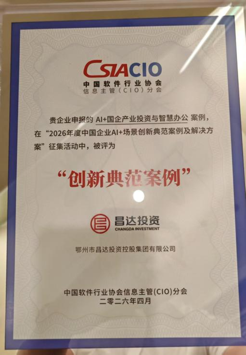 近日,鄂州市昌达投资控股集团有限公司与鄂州市城市大脑建设运营有限公司携手合作,打造"AI+国企产业投资与智慧办公"体系案例,被第五届中国国际软件发展大会、中国软件协会评为2026中国企业AI+场景创新典范案例。